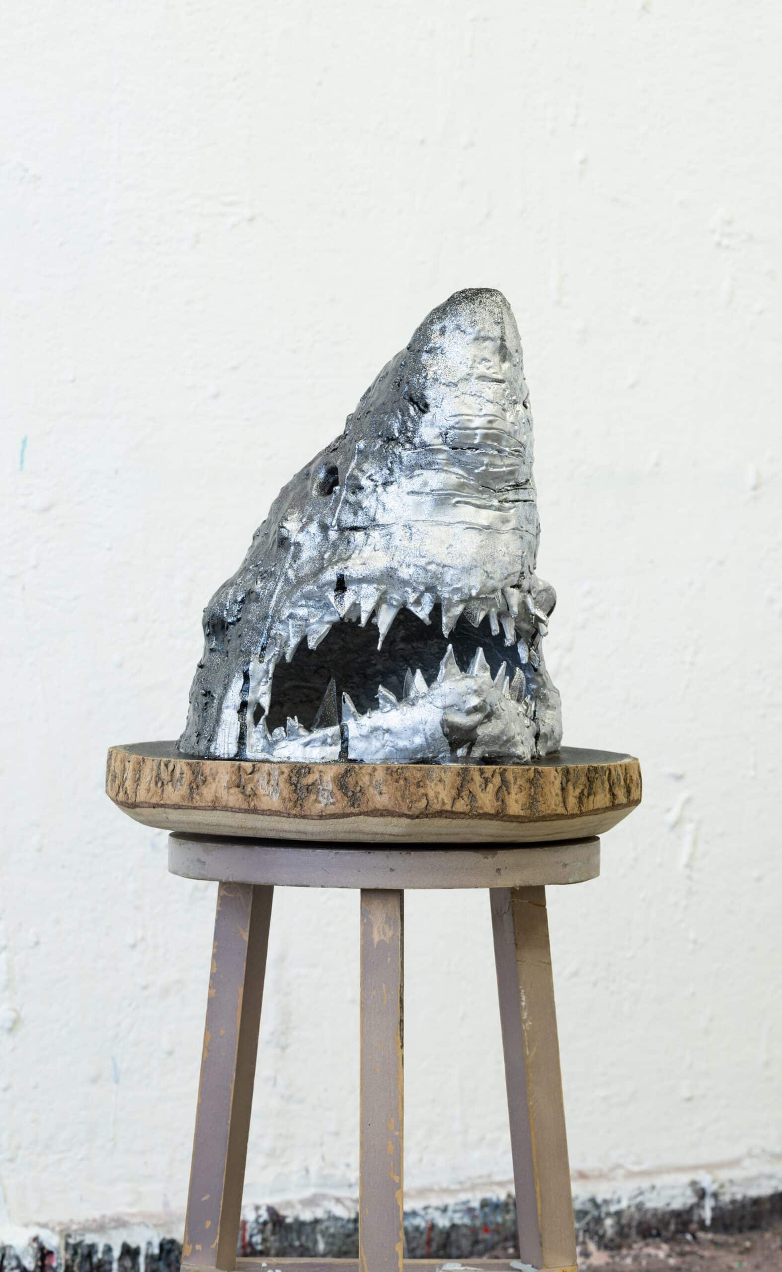 Foto links: ‘Bullet Head’, 56x42x42 cm, aluminium, spray paint, polyester & wood, 2023. Foto- Ralph Roelse
